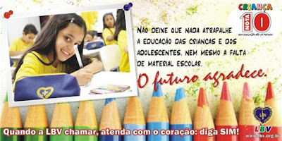 LBV inicia campanha que entregará milhares de kits de material escolar. Com o intuito de contribuir para que meninos e meninas de 6 a 12 anos em situação de vulnerabilidade concluam o Ensino Básico, a Legião da Boa Vontade deu início à sua tradicional campanha Criança Nota 10 — Sem Educação não há Futuro!, que entregará cerca de 10 mil kits de material escolar para os alunos participantes do programa LBV — Criança: Futuro no Presente!, desenvolvido nos Centros Comunitários e Educacionais da Legião da Boa Vontade. Esta iniciativa visa contribuir para a redução dos índices de reprovação e de abandono escolar e para a melhoria da qualidade de vida e da auto-estima de crianças e adolescentes. Os kits a serem entregues são compostos de vários itens, entre eles mochila, estojo, lápis preto nº 2, caixa de lápis de cor com 12 unidades, canetas esferográficas e hidrográficas coloridas, apontador com depósito, borrachas, pincéis, tesoura sem ponta, tubos de cola, caixa de tinta guache com 6 cores, cadernos de desenho e universitários, papel sulfite reciclado, régua de 30 cm, dicionário de língua portuguesa e jogo pedagógico. Para colaborar com a campanha dirija-se ao Centro Comunitário e Educacional da LBV localizado a Rua Dos Caicós, 2148 – Dix-Sept Rosado. Outras informações pelo tel. (84) 3613-1655 ou acesse o Site www.lbv.org.br.